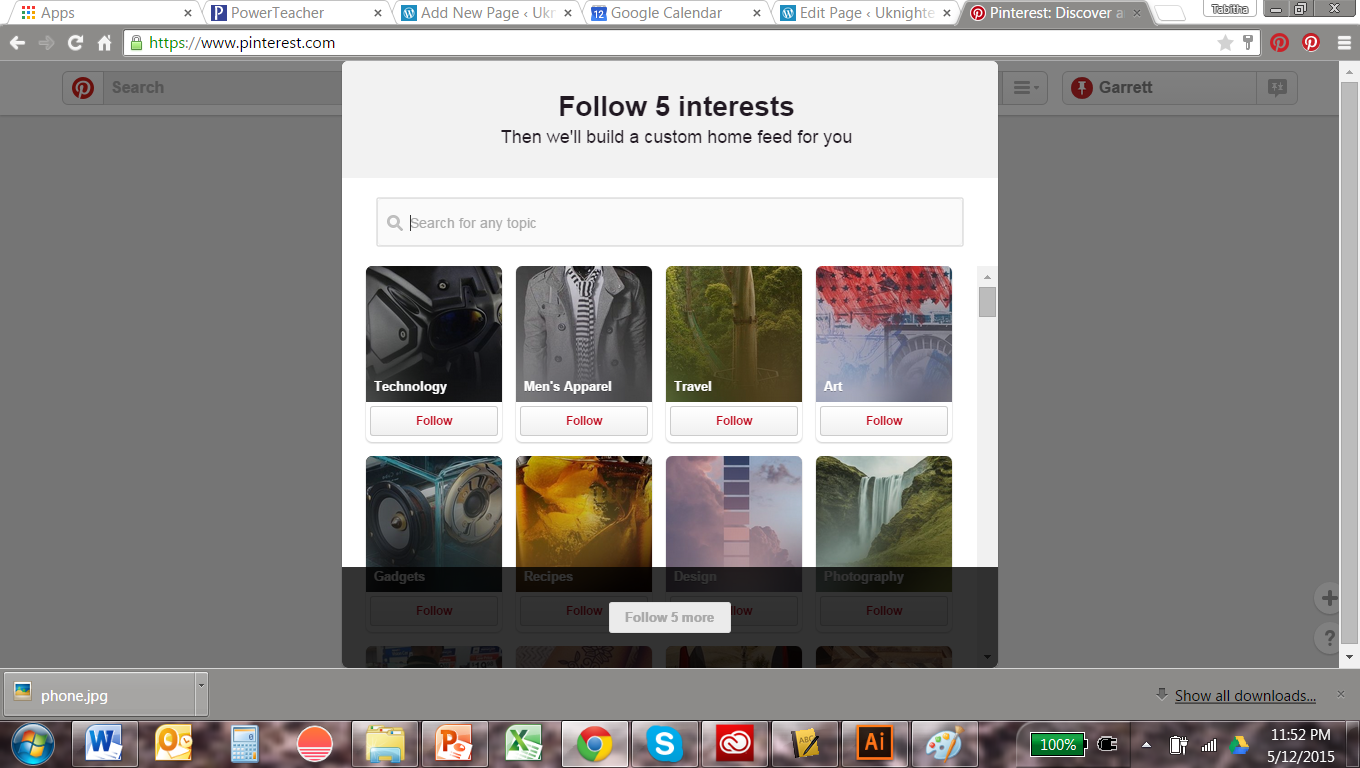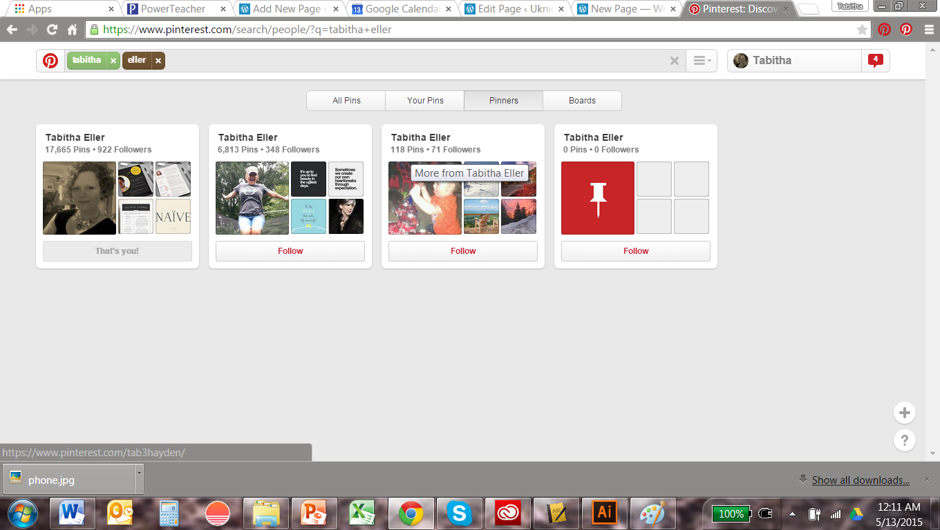 6. Then follow me, so we can communicate, etc. Type in my name, Tabitha Eller, in the search bar and press the ‘pinners’ tab and you should see my picture pop up. Below, it is the first one.